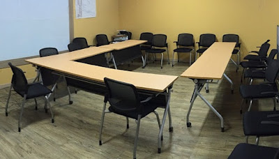 | lecture chairs positioned around tables arranged in a u-shape |